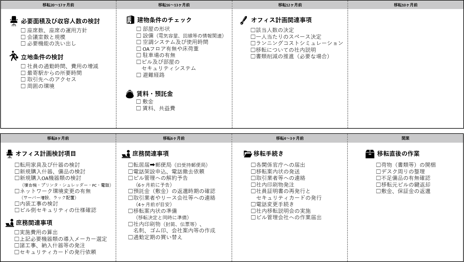 移転時期ごとのチェックリストをまとめた資料は下記の通りです。移転計画を進める際にぜひご活用ください。