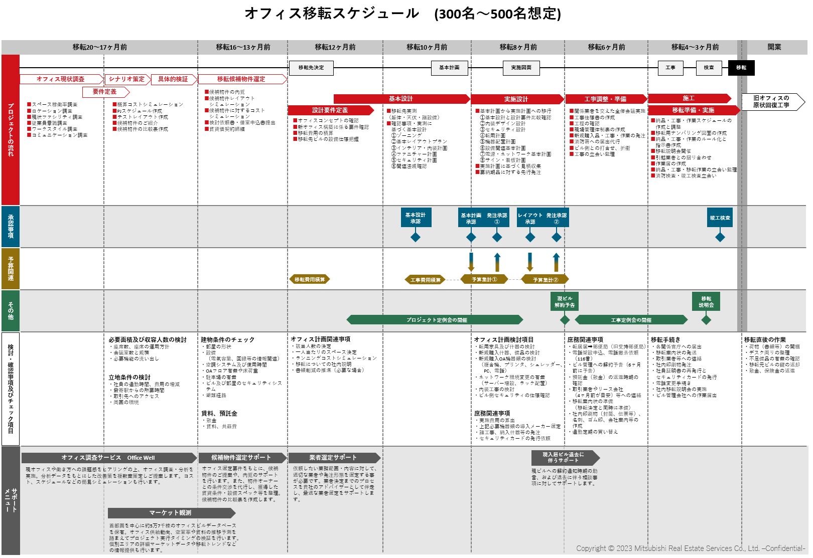 三菱地所リアルエステートサービスでは、プロジェクトの進め方や、社内承認事項のスケジュール、各フェーズでのTo Doリストなどを網羅した「オフィス移転スケジュール資料」をご用意しております。各フェーズにおいてご利用いただけるサポートメニューについても記載しておりますので、移転スケジュ―ル作成にお役立てください。
