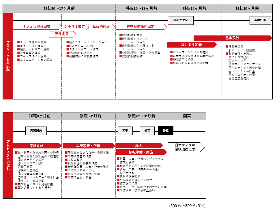 ここからは、300名~500名規模のオフィス移転を想定したスケジュールに基づきご説明します。