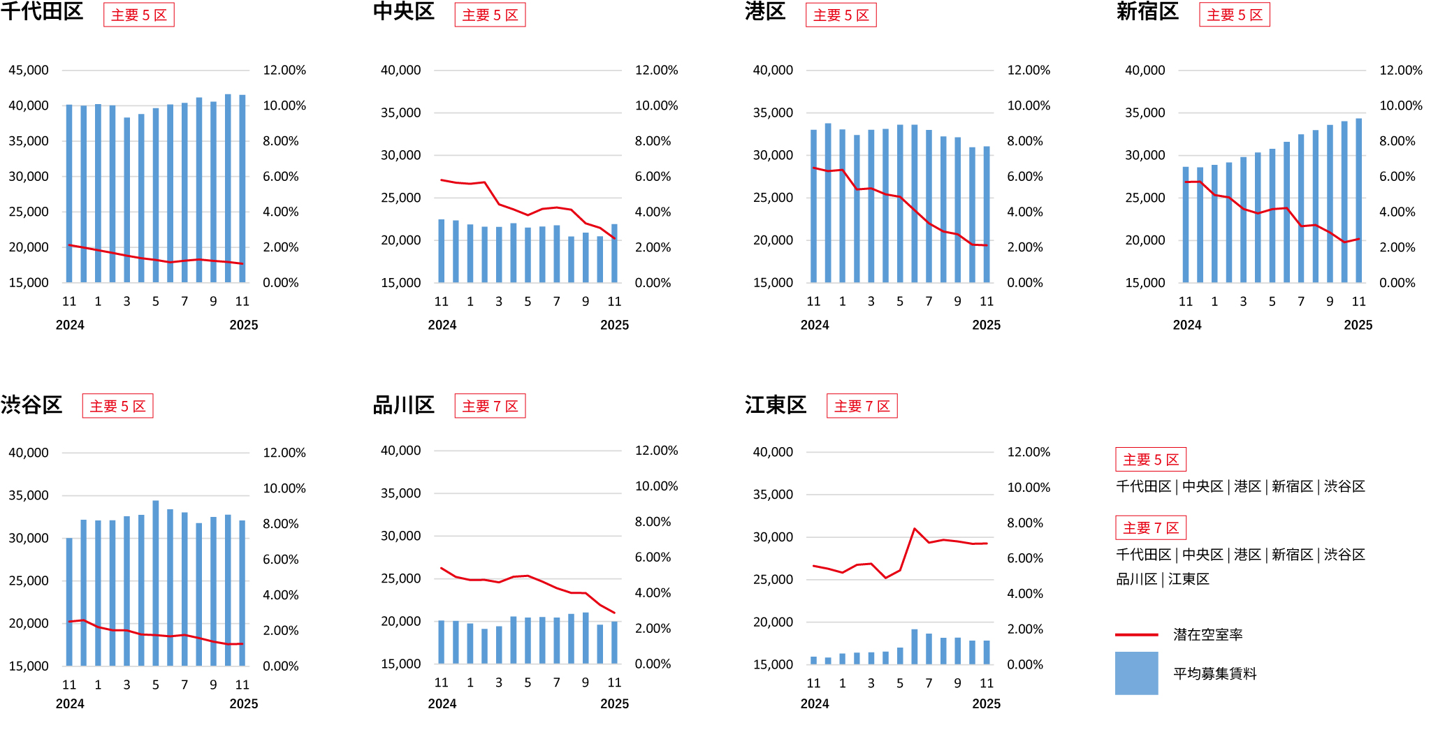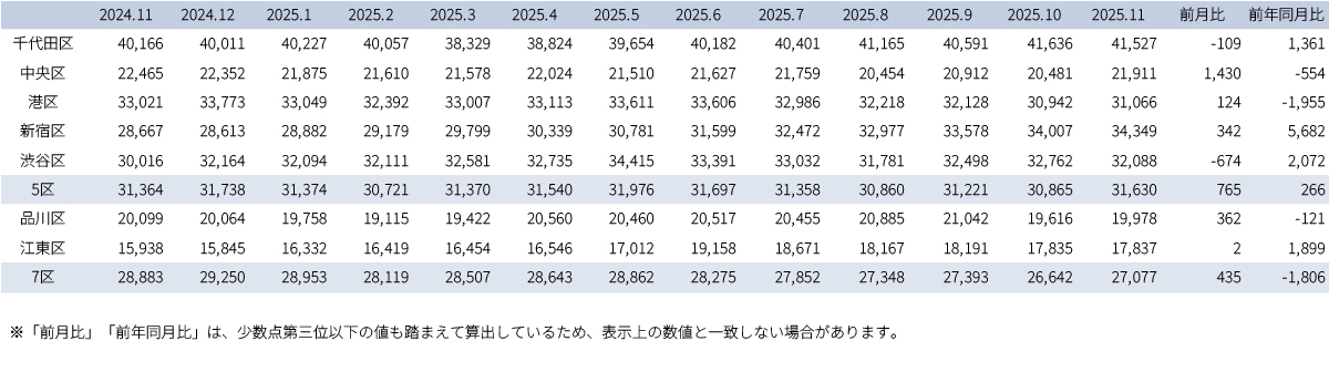前月末時点ではすべての区で潜在空室率が低下したが、11月末時点では新宿区、渋谷区、江東区はわずかに上昇した。