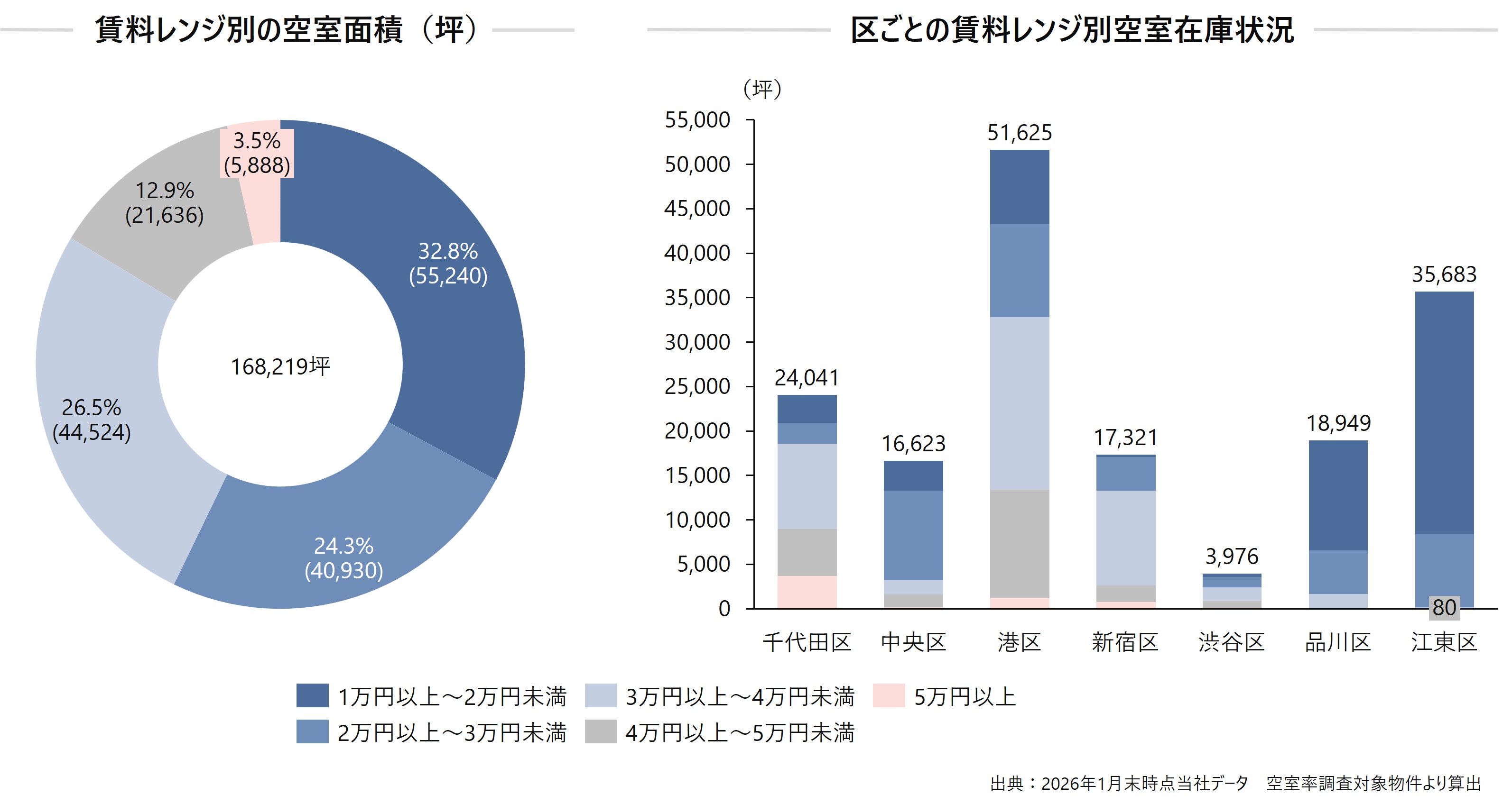 主要7区全体の空室面積の合計約16.8万坪のうち坪1万円台での募集が33%で最多、次いで坪3万円台での募集が続く。最多の空室を抱える港区(約5.1万坪)が中高価格帯中心であるのに対し、2位の江東区の空室は低価格帯が大半で、エリアによって空室量だけでなく価格帯にも顕著な差が見られる。港区は様々な価格帯の募集があり選択肢が豊富であり、渋谷区は需給の逼迫により圧倒的な「貸し手市場」である。また江東区はコスト削減の受け皿として機能しており、エリアごとの需給の歪みから、エリアによって移転戦略を大きく変える必要性があると思料される。