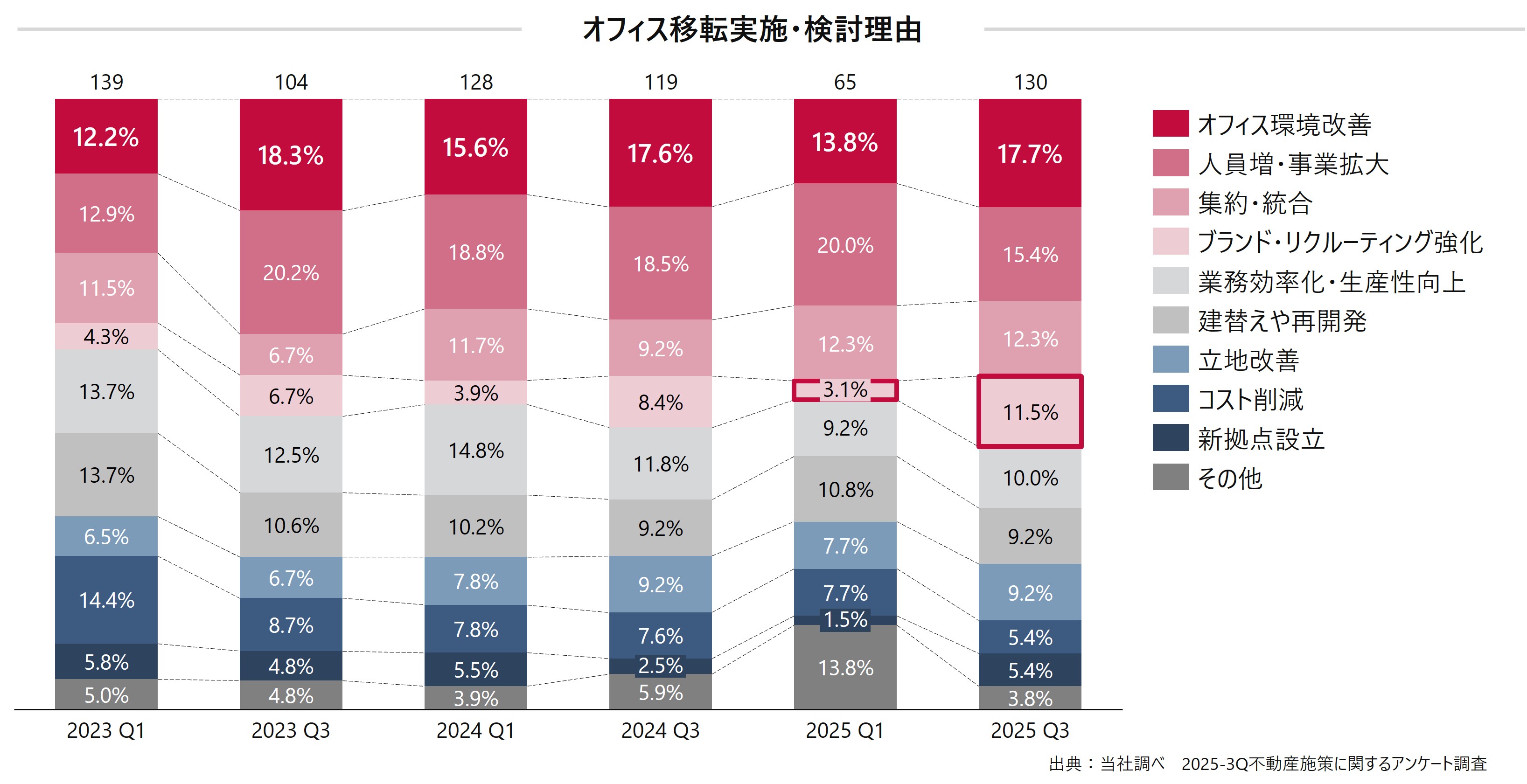 ・当社が実施した調査では、移転実施・検討理由については「オフィス環境改善(前回比+3.9pt) 」が最も多く、「人員増・事業拡大(前回比-4.6pt)」が続き、「ブランド・リクルーティング強化(前回比+8.4pt) 」の割合が調査開始以来の最高値を記録した。